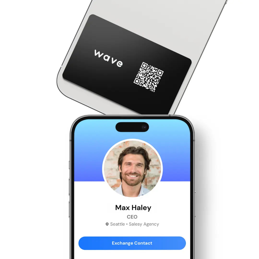 Primeiro, crie seu perfil Wave usando nosso aplicativo móvel gratuito ou painel de desktop. Em seguida, conecte seus produtos de pacote ao seu cartão de visita digital. Por fim, basta tocar seu novo cartão no telefone de um destinatário para trocar informações de contato.